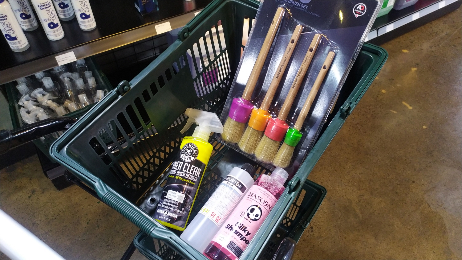 왼쪽부터 신제품인 쿨 에이피씨 프리워시 다목적 세정제, 실키 카샴푸, 슬리키 왁스, 아이언 몬스터까지 매스코닉 제품 모두 판매를 하고 있습니다.