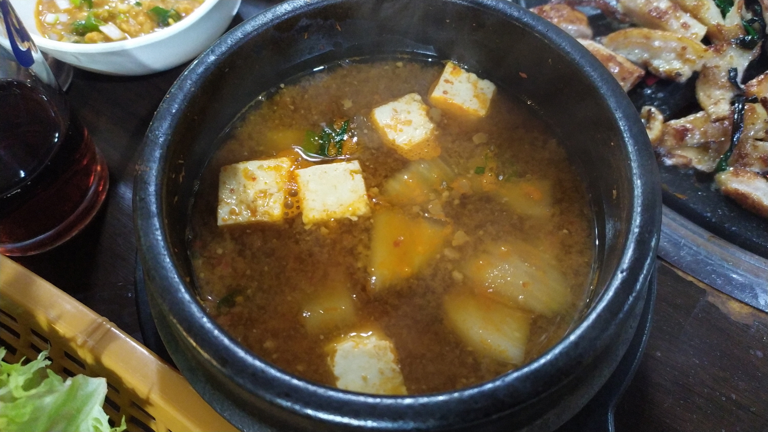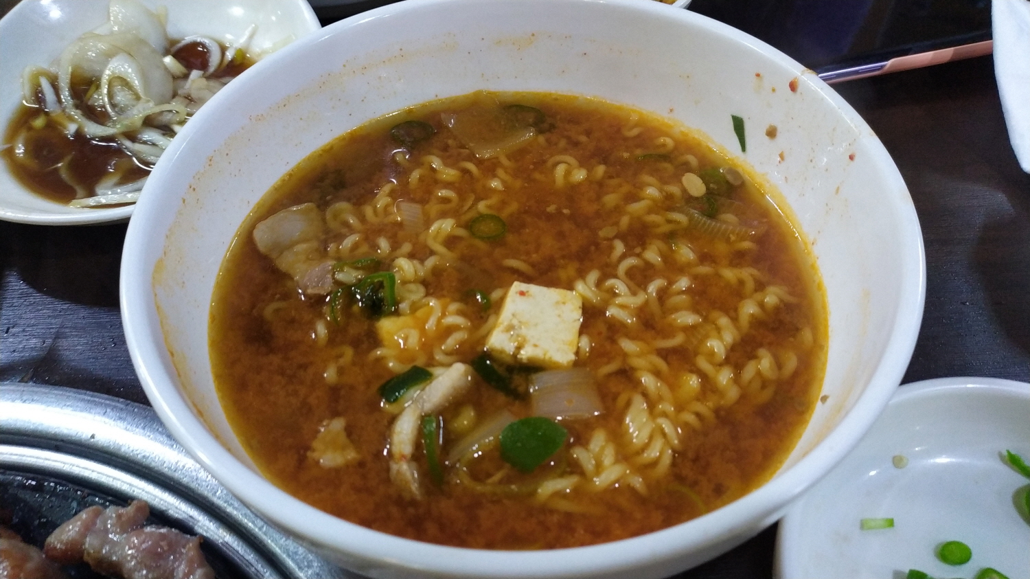 밥과 함께 나온 된장찌개와 해물라면. 참고로 해물라면은 별도 주문한 메뉴임