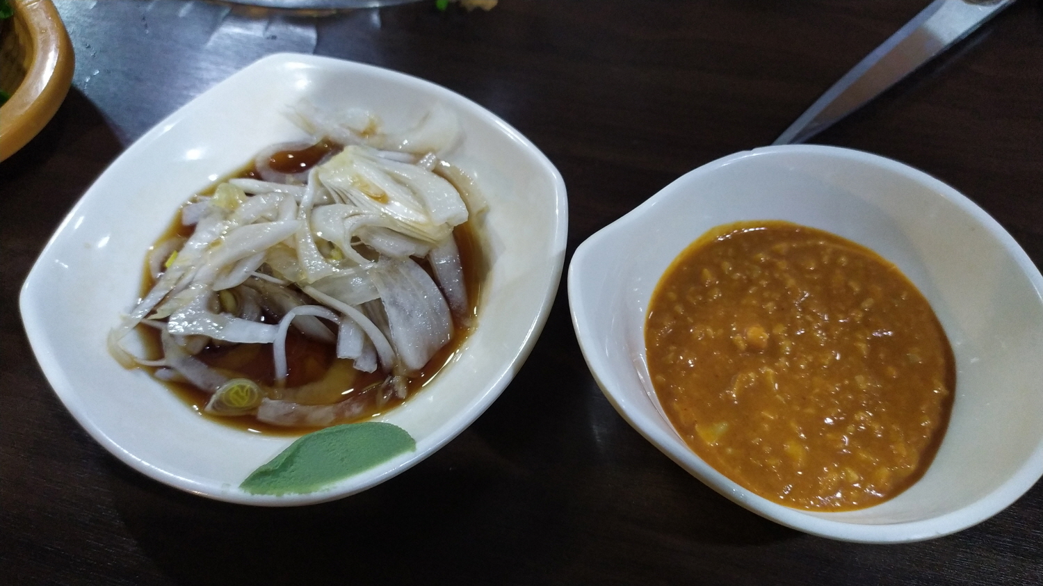 어느 막창집이나 비슷한 막장과 양파소스 그리고 막장을 조제할 재료인 고추, 파, 마늘