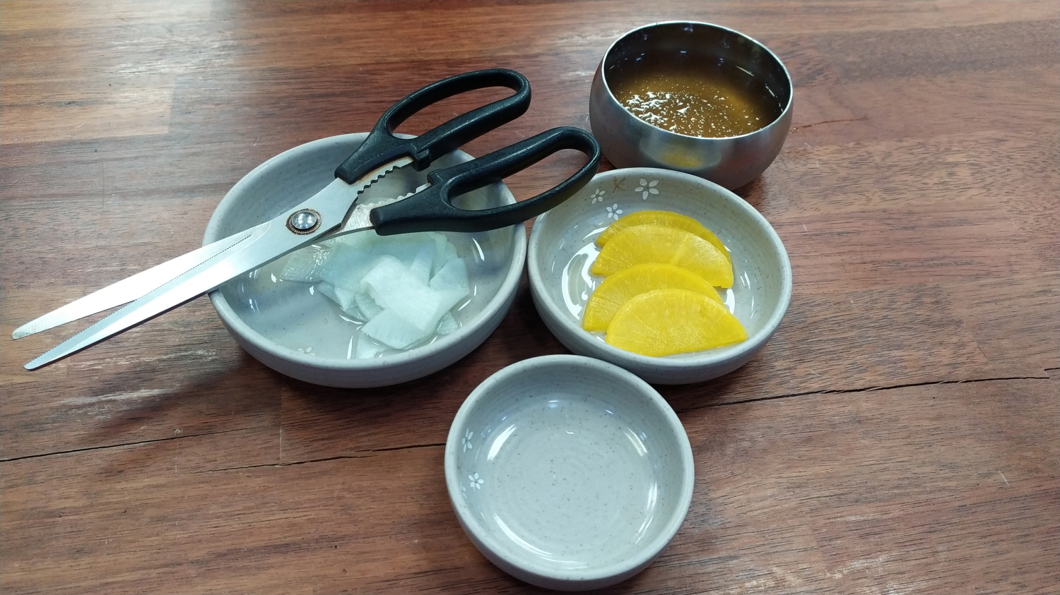 주문과 동시에 세팅되는 단무지와 비빔밀면 소스? 입니다.