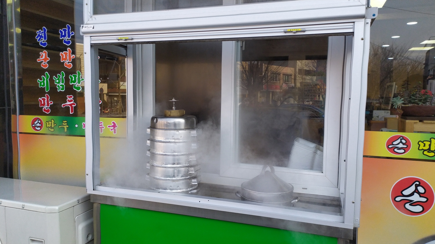 카운터 뒤편에서 만두를 직접 빚고 책장 같은 곳에 올려 두었다 손님들에게 쪄주는 듯합니다.