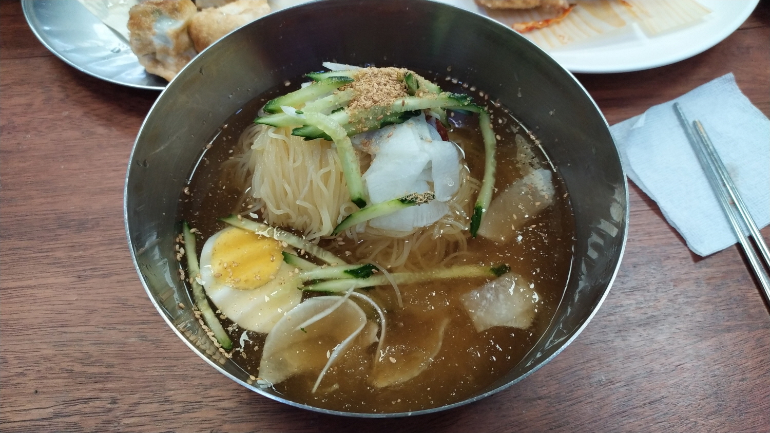 손만두 시식후 목이 말라 바로 밀면으로 넘어왔습니다. 밀면의 육수는 지금까지 먹어보지 못한 정말 간이 딱 맞고 여름이나 겨울에도 즐길 수 있는 무진장함버지기 대표 메뉴란 걸 충분히 느낄 수 있었습니다. 좀 전 먹어본 담백한? 만두와 함께 먹어니 더욱더 풍미를 느낄 수 있네요.