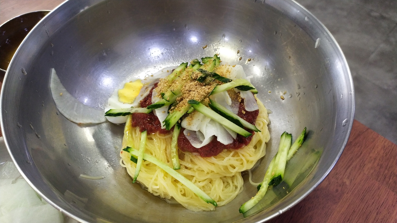 마지막으로 먹어본 메뉴는 비빔밀면입니다. 비비기 전에 비빔밀면용 소스를 살짝 넣어 비벼먹어라는 종업원의 말씀!! 처음 먹어보는 사람이라면 누구나 시키는 대로 먹어야겠죠?