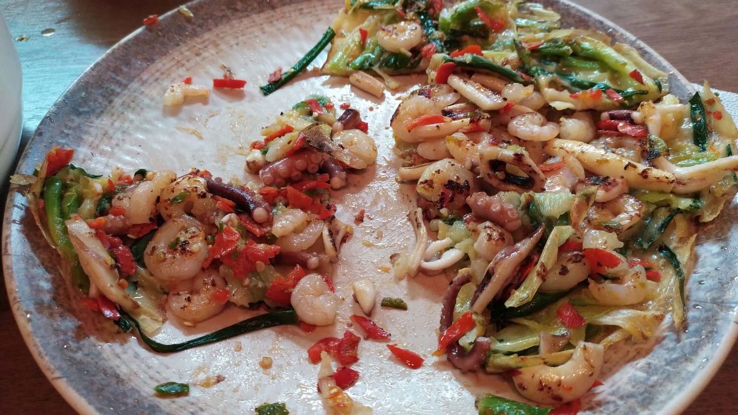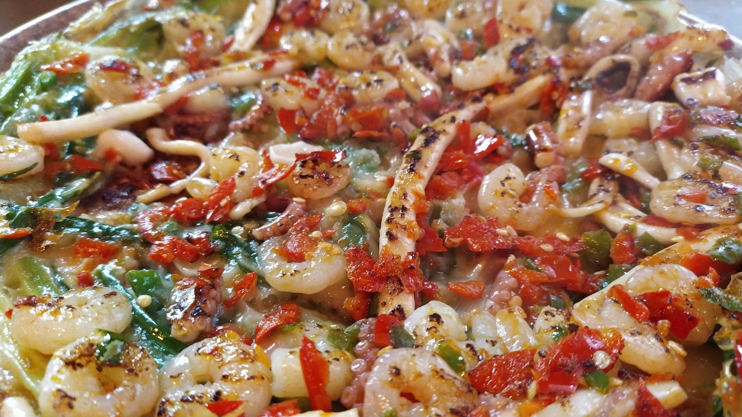 새우, 낙지, 오징어를 봐라! 장난 아니게 올려져 있다. 비싼 파전 가격 느낌은 순간 사라지고 없다.