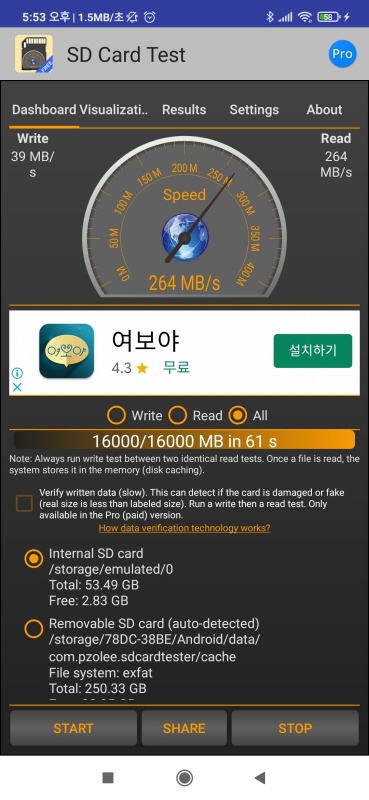 스마트폰 내장 메모리나 이번에 추가한 렉사 256GB 마이크로 SD 메모리카드나 쓰기에서는 크게 속도차이를 보이지 않지만 읽기에서는 생각보다 많은 차이를 보인다.
