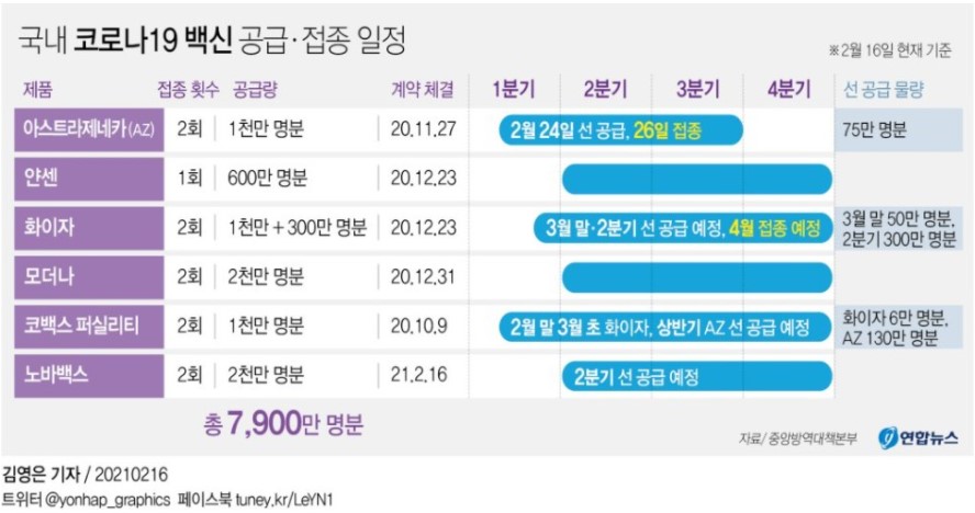 한국 정부가 코로나 백신 구입 정식 계약을 맺고 있는 것은 화이자사(미):1300만 명분, 아스트라제네카사(영국):1000만명분, 모데나사(미) 2000만 명분의 3사의 토탈만 하여도 5300만 명분으로 되어 있습니다.