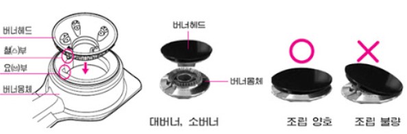 캡에는 자세히 보면 마크나 요철이 붙어있어 가스 레인지 본체에 그 마크를 맞춤으로써 단단히 끼울 수 있습니다.