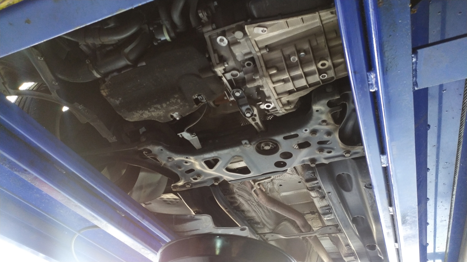 엔진오일 교체라 차량 하부 커버를 분리한다. 분리된 제타 하부를 보면서 앞으로 수리또는 교체할 시기를 말씀해주신다. 가장 먼저 하부 누유는 없는 것으로 확인되었다.
