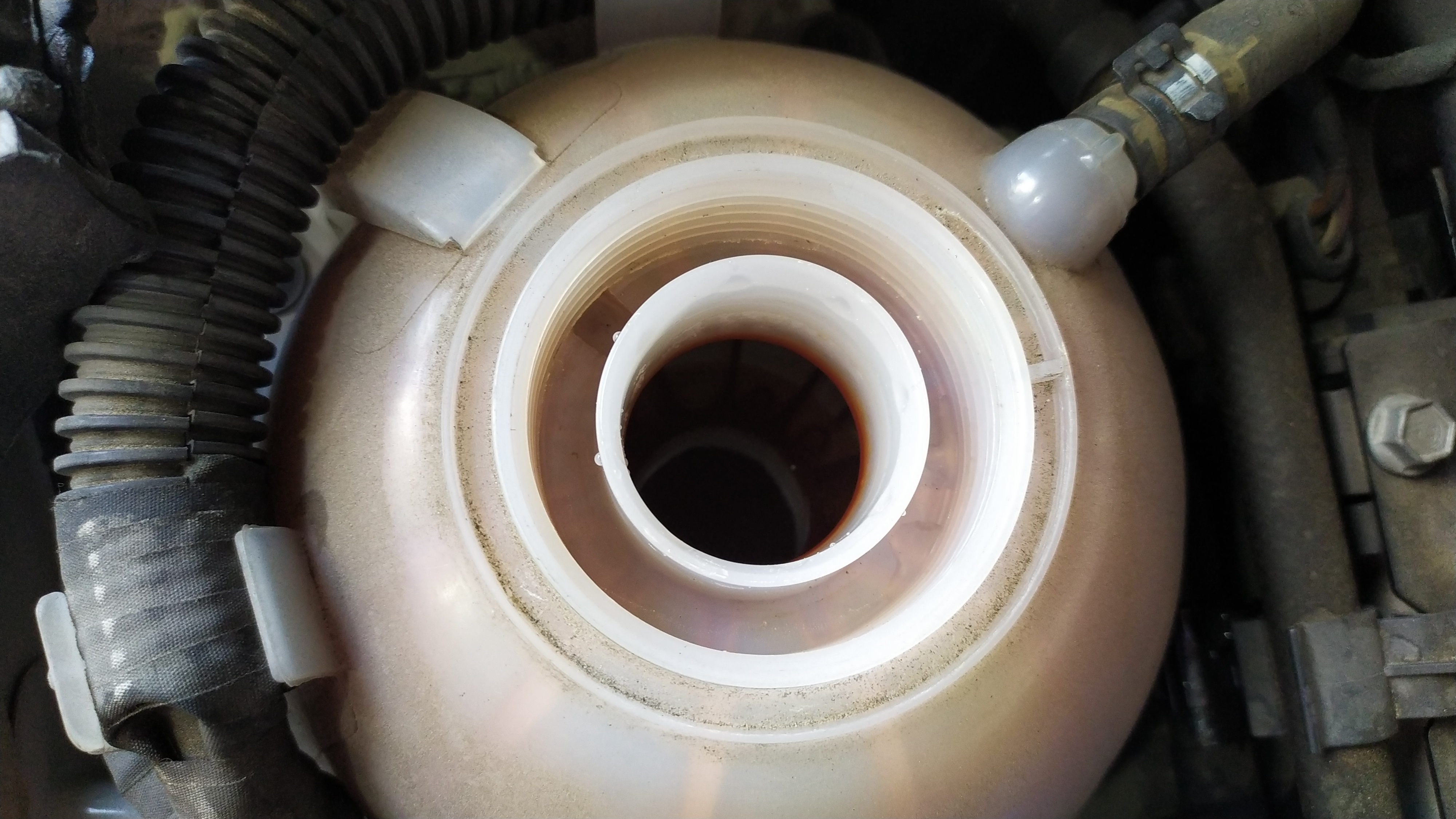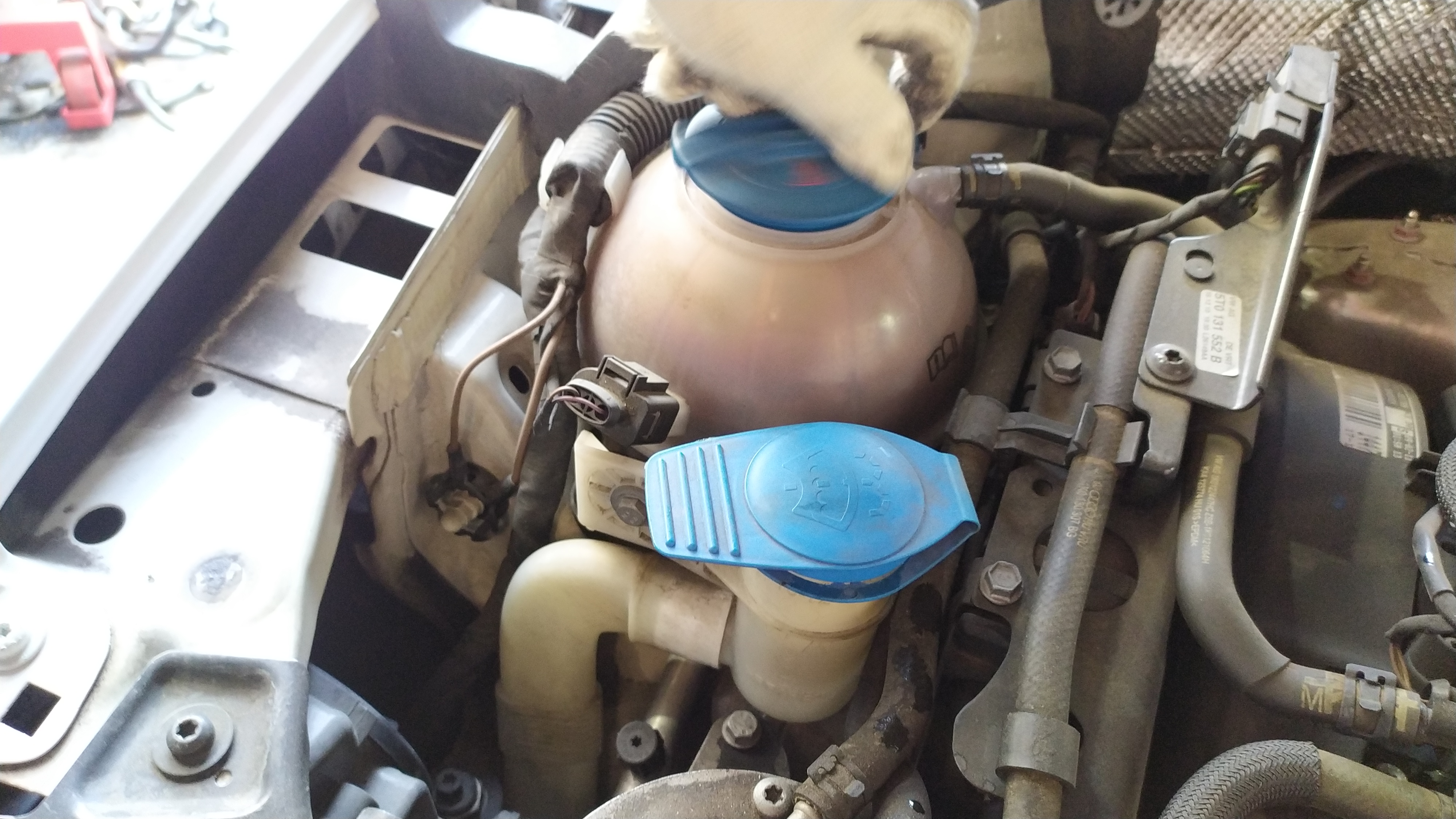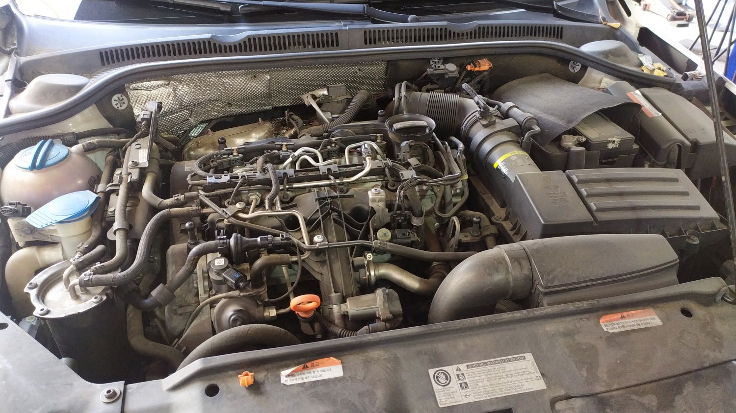아래 사진에 보이는 오일?통을 열어보시고는 바로 타이밍 벨트 교체주기를 말씀하시는 것 같았는데 아마도 오일 투명도를 보고 말하는 듯하다. 처음 신차 출고를 하고 살펴본 기억이 있는데 저 통 안에 들어있는 오일이 투명한 레드빛이 보였는데 지금은 약간의 탁한감이 느껴지는 블랙 색상을 보인다. 폭스바겐 제타를 소유하고 있는 분들은 참고하면 좋겠다.