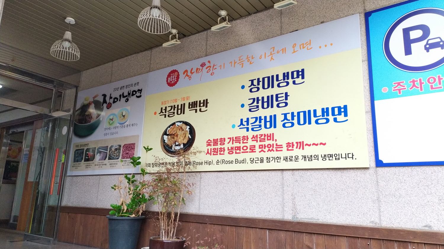 장미 냉면 주차는 식당 앞 빈 공간에 주차하면 되지만 주차공간이 협소하여 운전자가 알아서 주차를 해야 한다. 주말에는 더욱더 주차공간이 없어 헤매는 경우가 있다. 그래도 냉면이 맛있다면 주차문제는 별 문제가 되지 않는다.