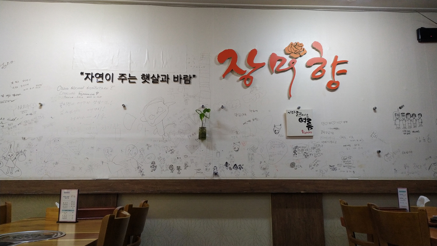 식당 내 한쪽 벽에는 사진처럼 손님들이 직접 흔적을 남길 수 있는 공간도 마련되어 있다.