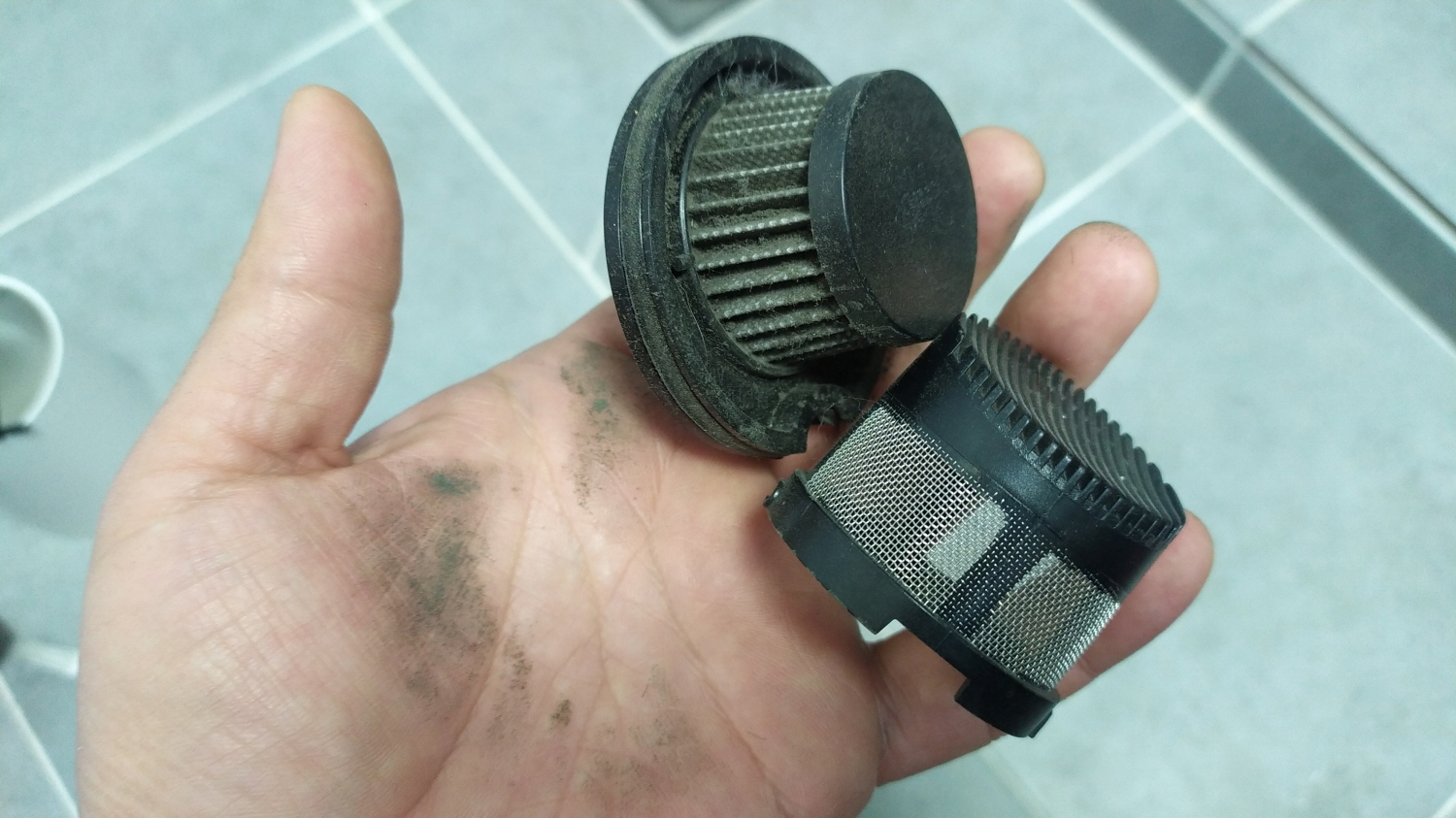 필터만 흔들어서 흐르는 물에 세척할 때와는 다른 먼지와 찌꺼기들이 나온다.