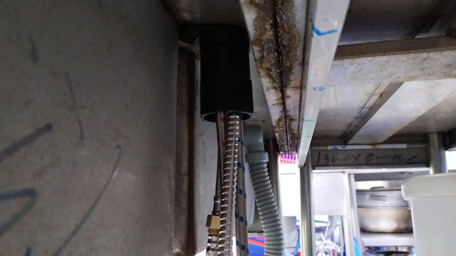 생각보다 작업이 수월하진 않습니다. 이유는 업소용 싱크대라 모든 싱크대와 스테인리스 냉장고등 연결이 되어있어 빈 공간이 없군요. 챌라가 있더라도 이런 경우에는 참 난감하겠네요.