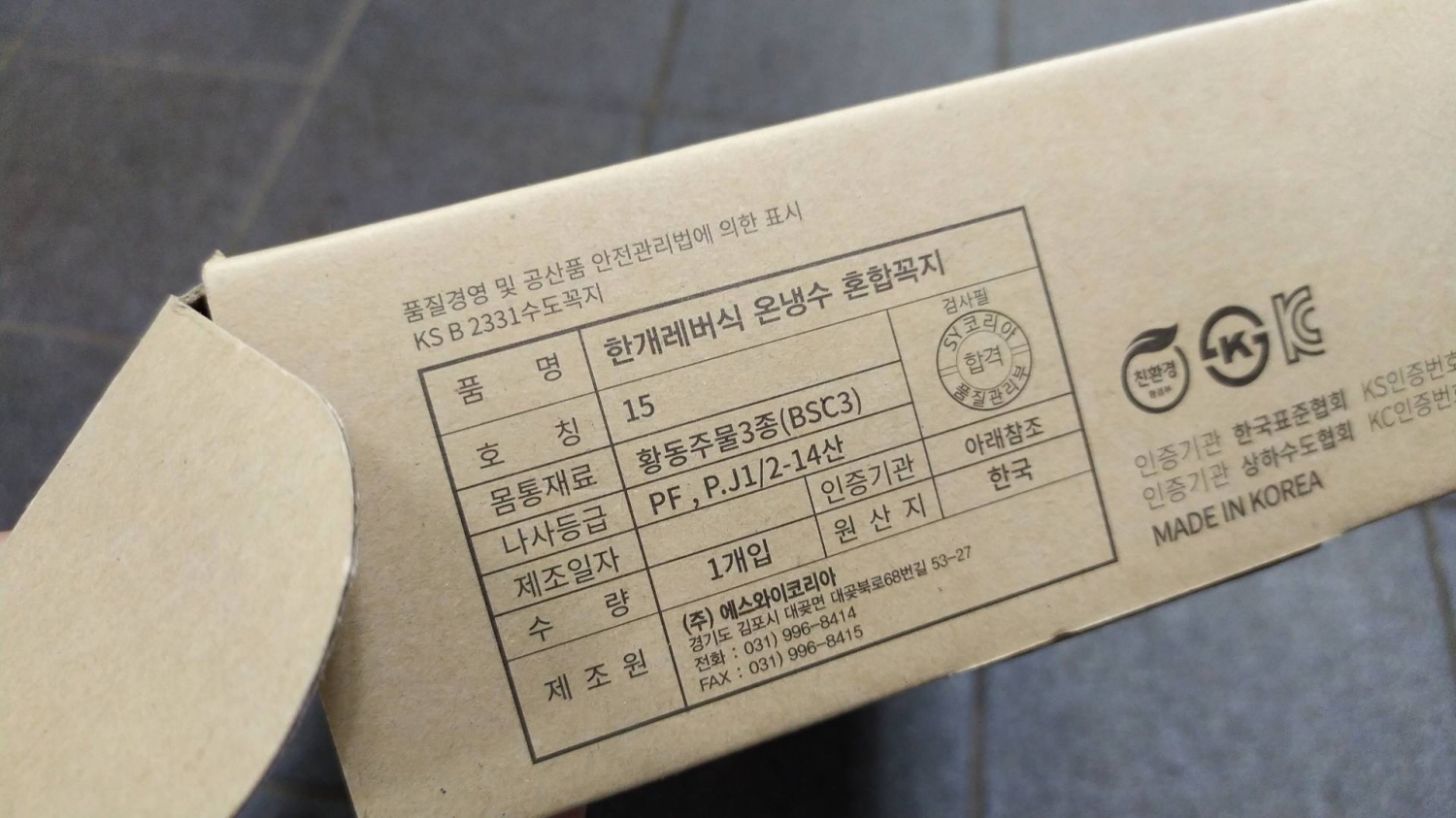 교체할 수전은 (주)에스와이 코리아의 한 개 레버식 온냉수 혼합 꼭지, 호칭 15, 몸통 재료 황동 주물 3종