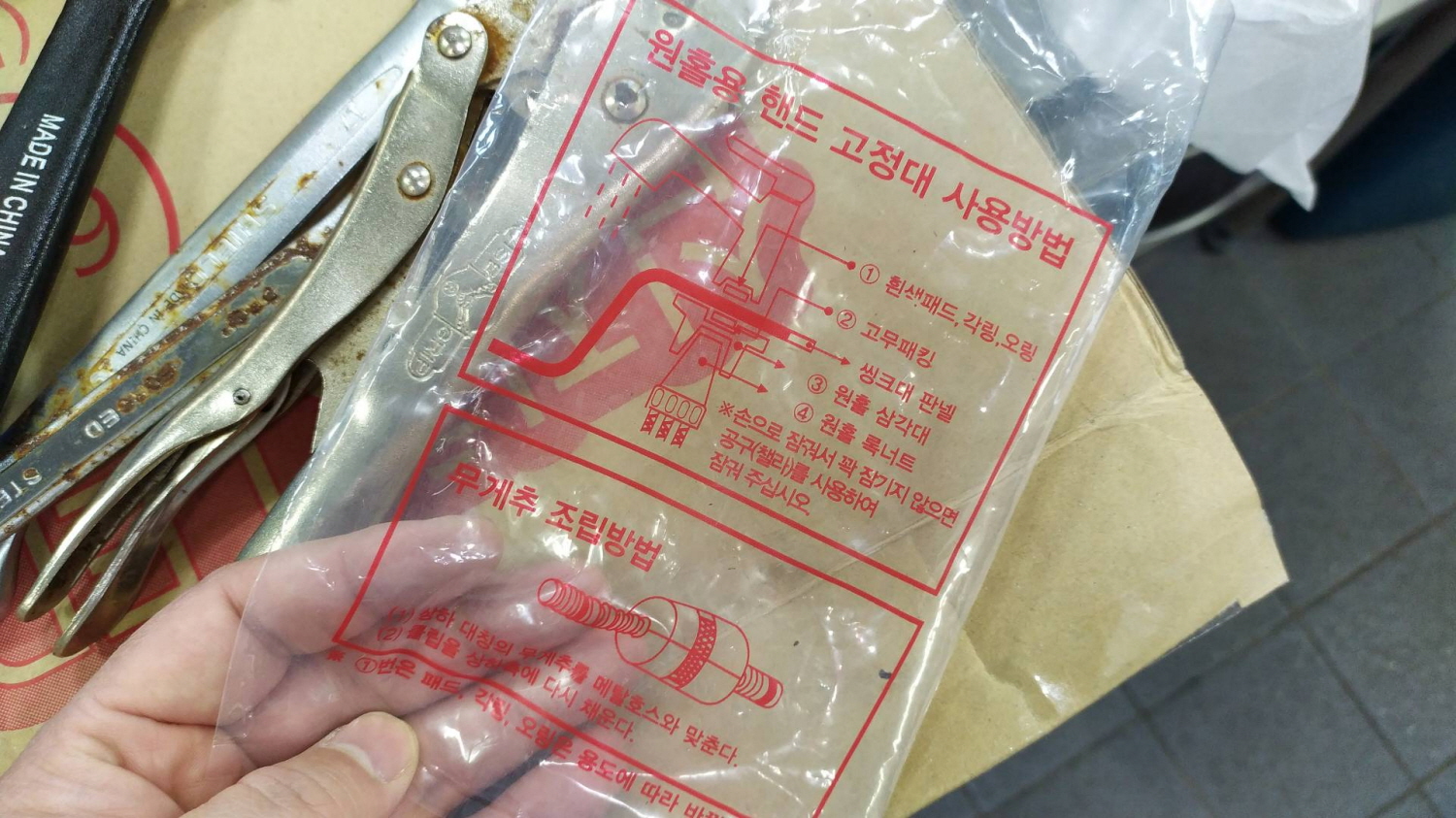 수전 교체방법이 기재된 비닐에 동봉된 부품들입니다.