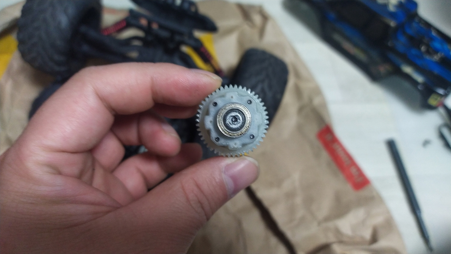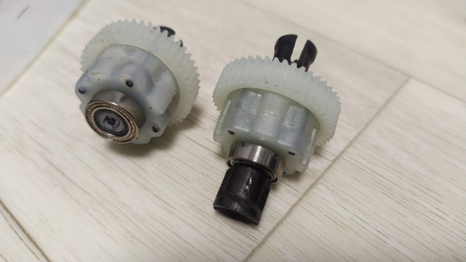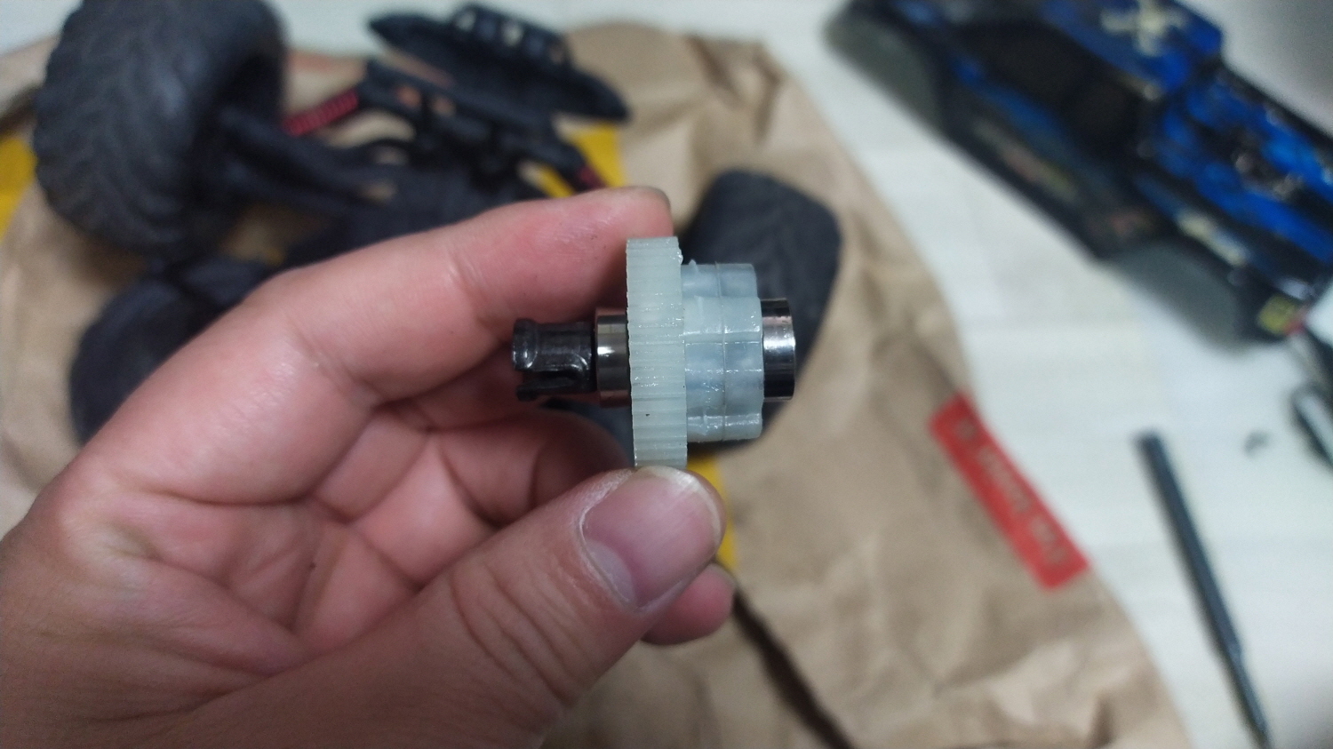 저 역시 RC카 완전 전문가가 아니니 사진으로 대신합니다. 아래의 사진을 보시면 바퀴랑 축이랑 연결이 되어 있어야 하는데 축을 잡아주는 바구니 부분이 파손되어 축이 연결이 안 되어 앞바퀴에 동력이 전달되어도 자동차는 앞으로 나아가질 못하는 고장이 발생했습니다.