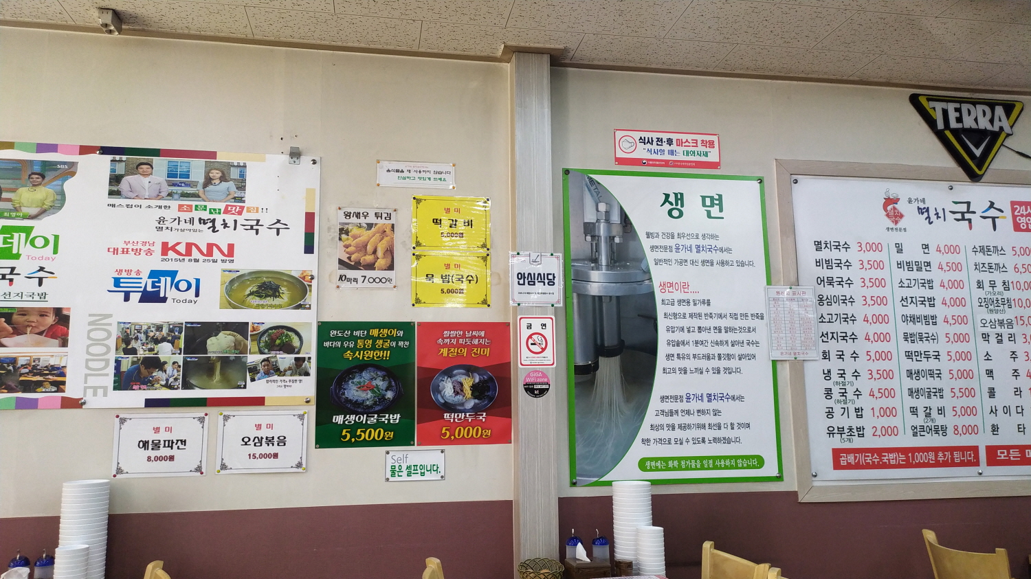 그렇다 윤가네 멸치국수 대구본점 주차장에서부터 이곳의 국수 맛은 결정되었다. 국숫집 어딜 가나 메뉴 가는 많아야 2~3가지이다. 하지만 윤가네 멸치국수 대구 본점은 메뉴가 어마어마하게 많다. 국수는 시작으로 국밥/밀면/회무침/돈 까스등 등 국수전문점에서 판매하지 않는 메뉴들이 너무 많다.
