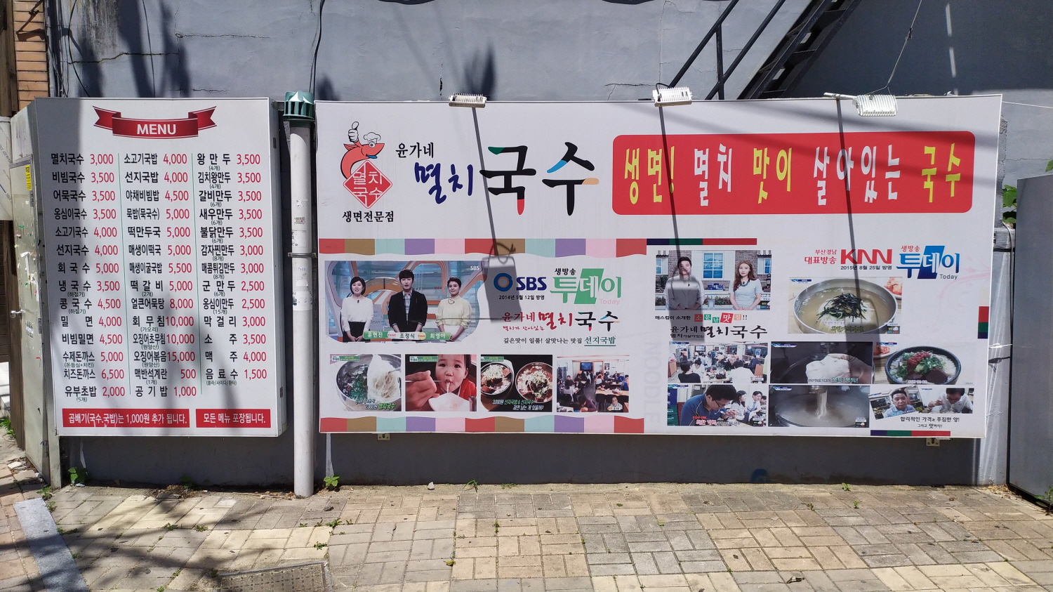 주차장에 걸려있는 윤가네 멸치국수 대구 본점 메뉴판과 언론에 소개된 현수막까지... 보기 좋게 걸려있다.