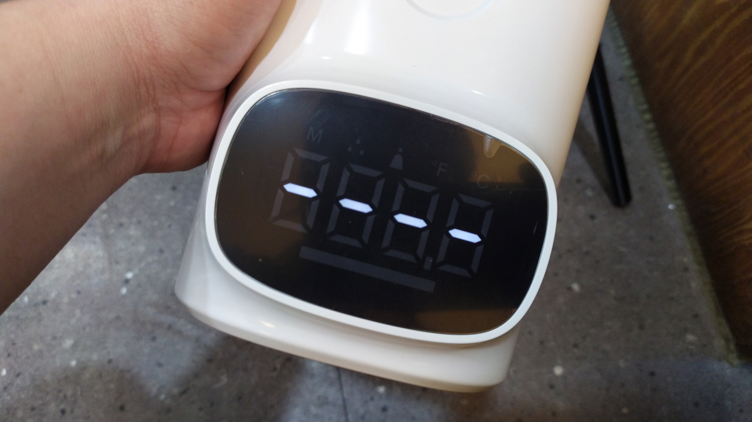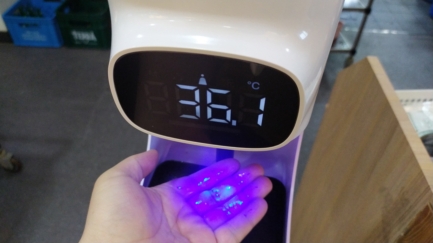 손소독기 하단 전면에 보이는 액정에서는 몇 가지 정보를 나타내어 준다. 측정된 온도 표시를 섭씨 또는 화씨로 변환이 가능하고, 추가 기능설 정시 도움말이 제공된다.