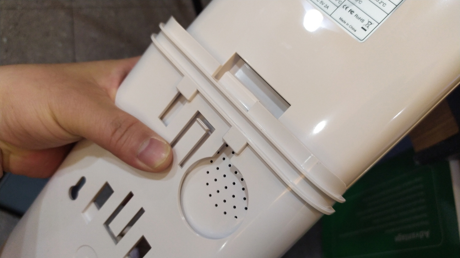 aa건전지 사용을 위해서는 k9 pro plus 본체를 개봉해야 한다. 개봉하는 방법은 본체 상단에 화살표 스티커 방향을 눌러 열어주면 된다.