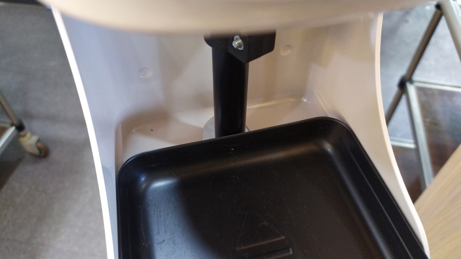 손소독기에 삼각대를 사용하면 손소독제 받침대 조립이 안된다. 소독제 받침대 하단에는 소독기와 연결되는 별다른 나사나 연결 클립이 없다. 아쉽지만 소독제 받침대에다 양면테이프를 사용하여 고정했다. 용기가 있다면 소독제 받침대에다 구멍을 내어주면 좋겠지만 세척이 힘든 관계로 포기했다.