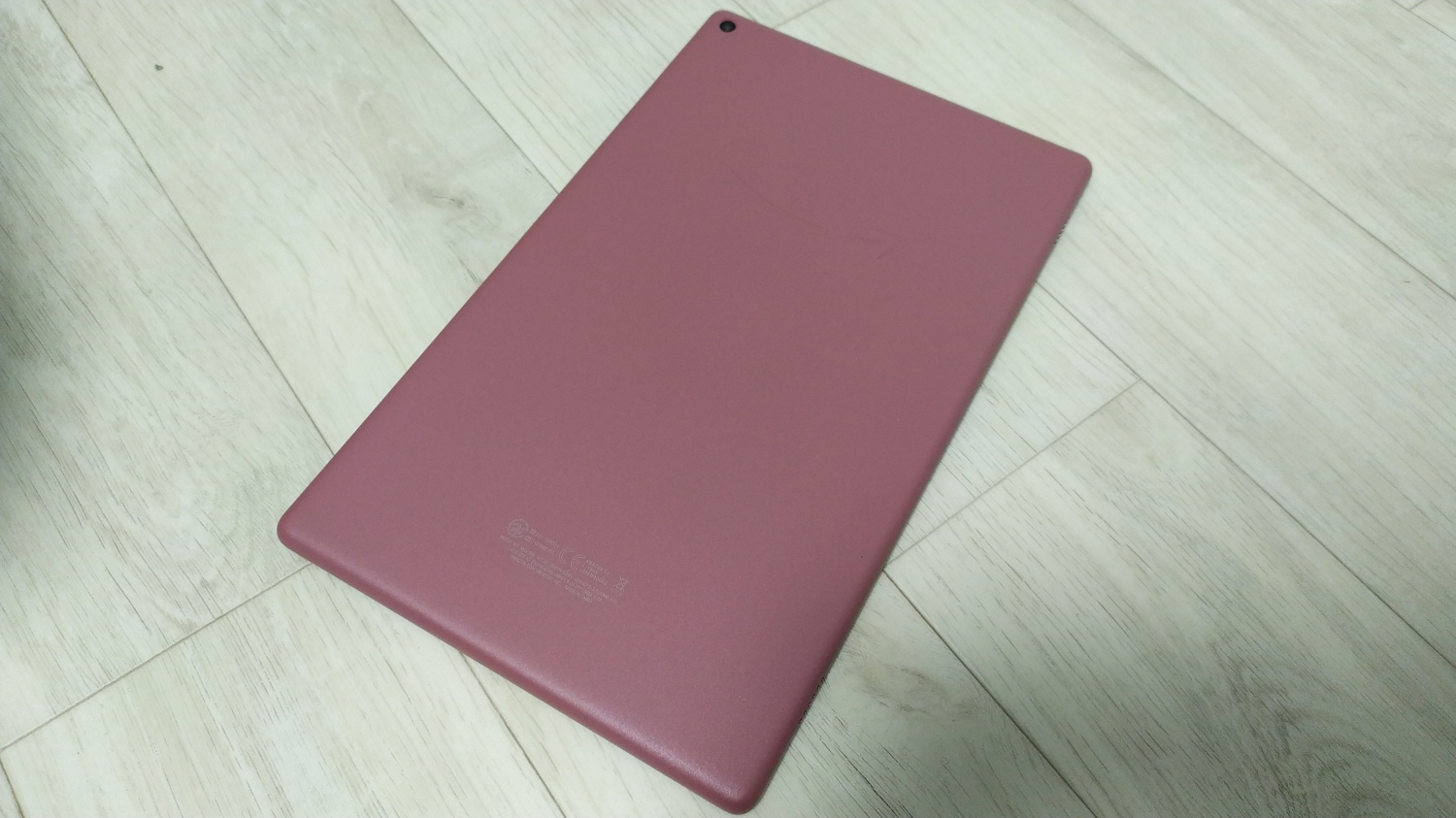 아마존 파이어 HD 10 후면입니다. 사진으로는 잘 보이지 않지만 후면의 아마존 로고가 다른 로고로 변경되었습니다. 그 전 태블릿에는 영문 이니셜까지 있었지만 지금은 웃는 얼굴 로고만 새겨져 있네요.