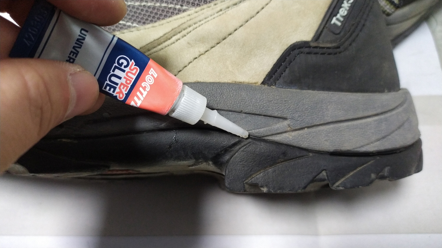 등산화 밑창에다 록타이트 신발용 순간접착제를 꼼꼼하게 발라준다. 참고로 떨어진 등산화 밑창을 자세히 보면 제작 시 본드가 사용된 흔적들이 보이니 그대로 발라주면 된다.