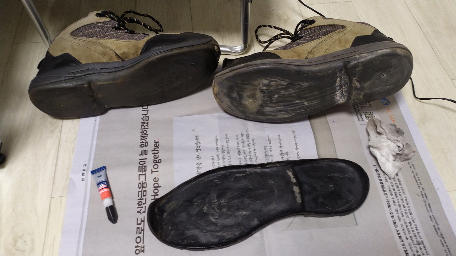 등산화 밑창에 접착제를 모두 발라주고 잠시 기다림을 가진 뒤 버러지는 부분에 다시 꼼꼼하게 발라주면서 마무리를 해본다.