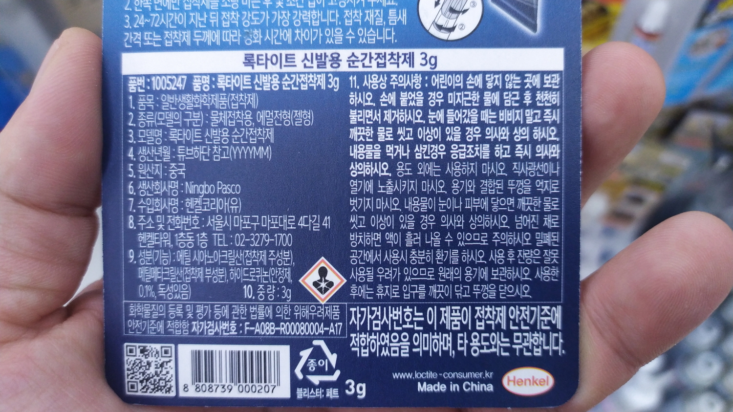록타이트 신발용 순간접착제는 3g이 들어가 있다.