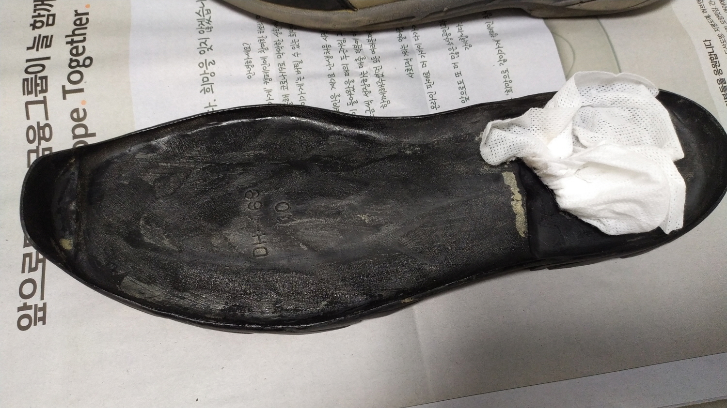 최선을 다해 등산화 밑창과 떨어진 등산화 발바닥을 물티슈로 깨끗하게? 닦아준다.