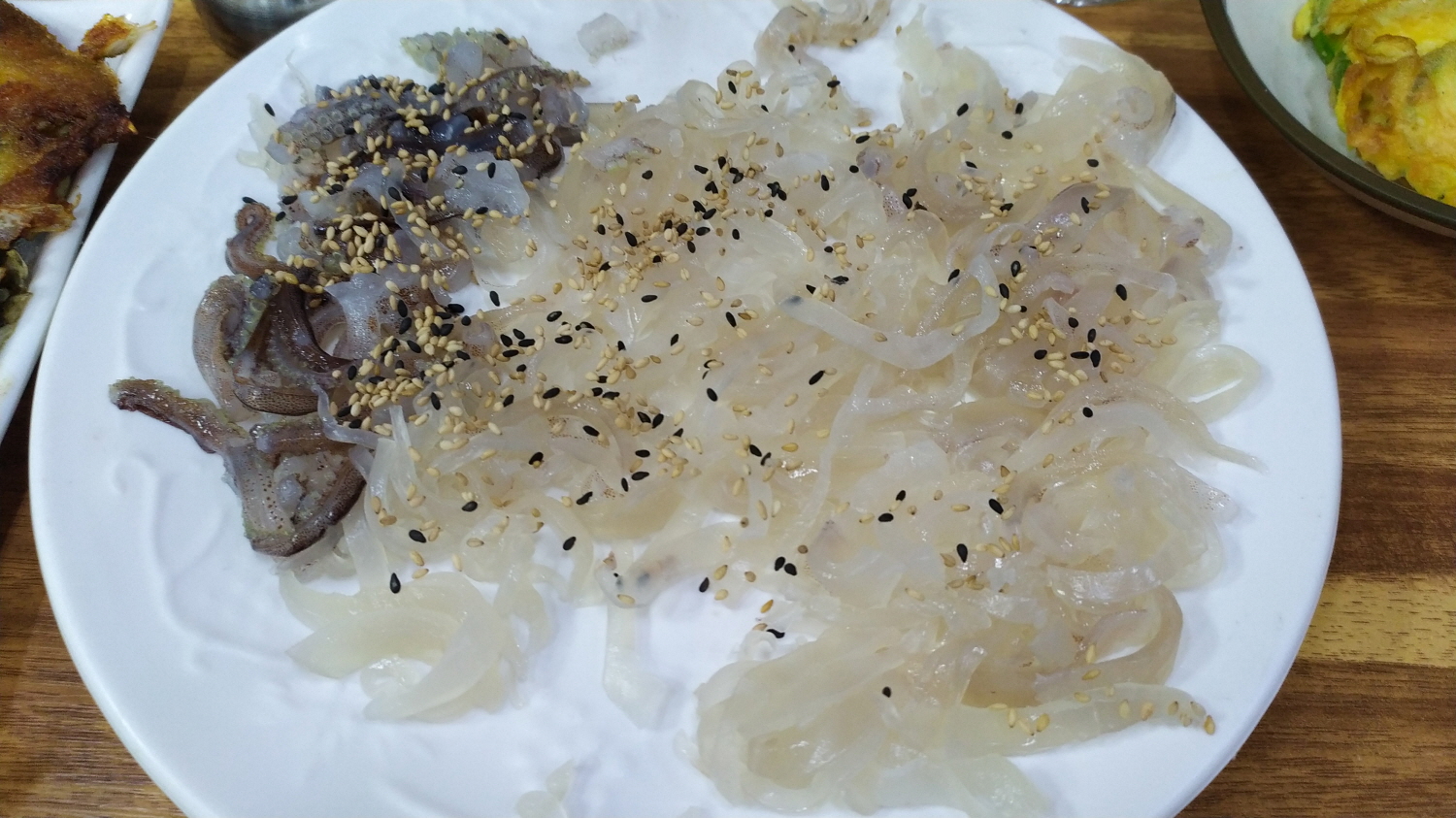 산오징어 한 접시, 모둠회 주문했다. 모둠회는 사장님께서 알아서 그날 물 좋은 놈들로 준비해주신다고 하니 믿어보기로 하고 먼저 나온 오징어회부터 시작한다. 산오징어 한 접시에 아마도 가격이 3만 원으로 기억함.