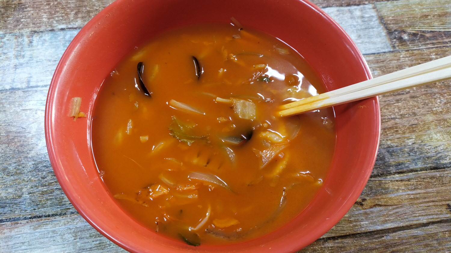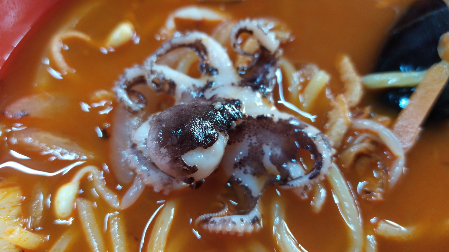 주문한 매운 해물짬뽕이 나왔다. 일반 해물짬뽕도 있지만 숙취해소를 위해 오늘은 매운맛으로 달려본다. 나온 짬뽕국물을 보니 매운맛? 1도 느낄 수 없다.
