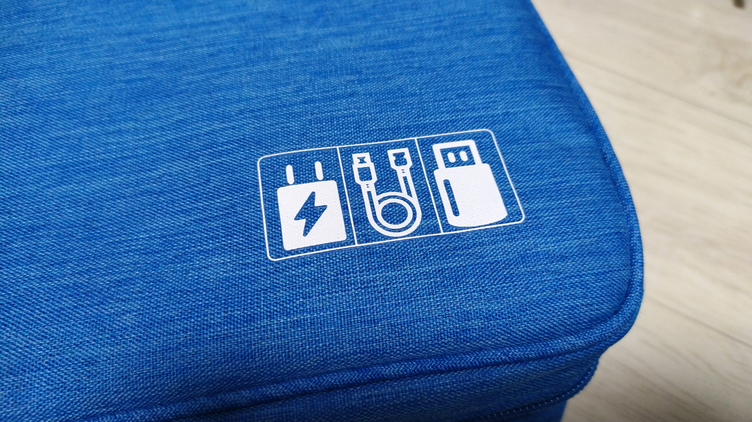 파우치 뚜껑? 오른쪽 하단에는 휴대용 충전기, USB 케이블, USB 메모리 아이콘이 나염 프린팅이 되어있어 누구도 가방을 보면 어떤 물건들이 담겨있는지 쉽게 알 수 있게 되어 있다.