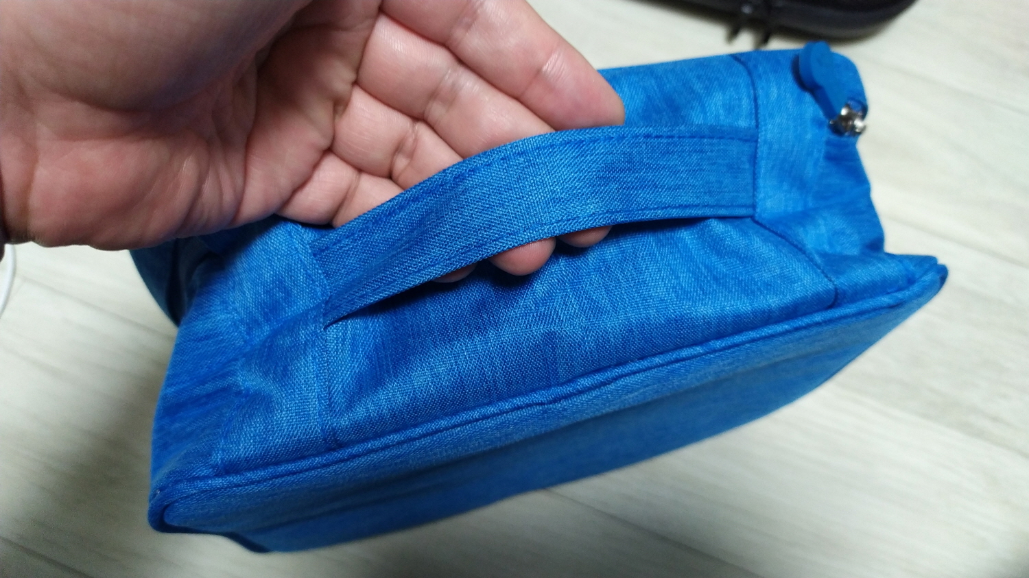 파우치 상단에는 손잡이가 달려있으며, 전체적인 봉제 마감이 깔끔한다.