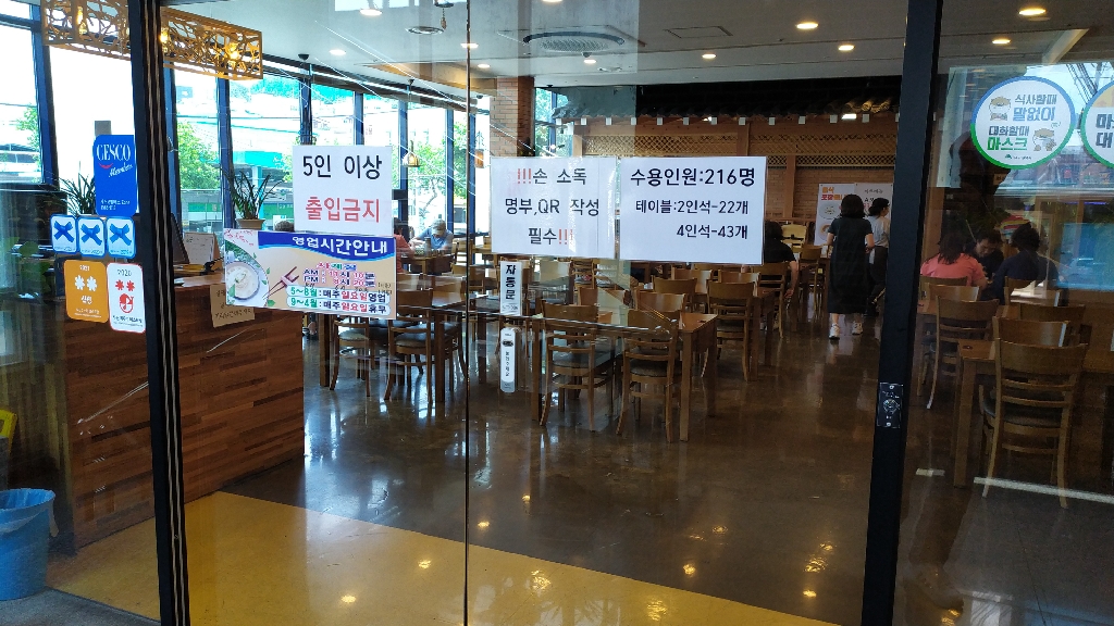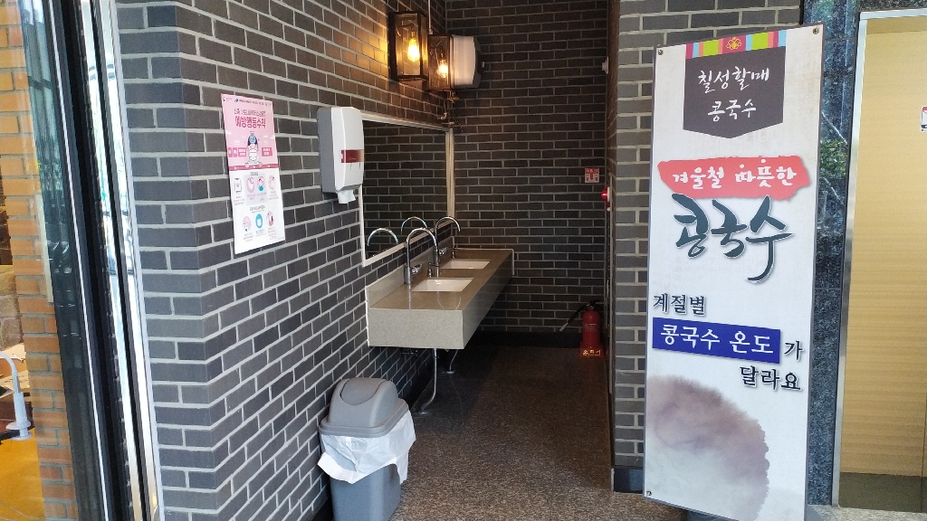 2층 식당 입구에 손님들의 청결을 위해 세면대가 준비되어 있다. 개인적으로 손소독보다 세척이 더 바람직하다는 느낌이라 이런 세면대가 있는 식당을 더 선호하지만 아직 많이 보진 못했다.