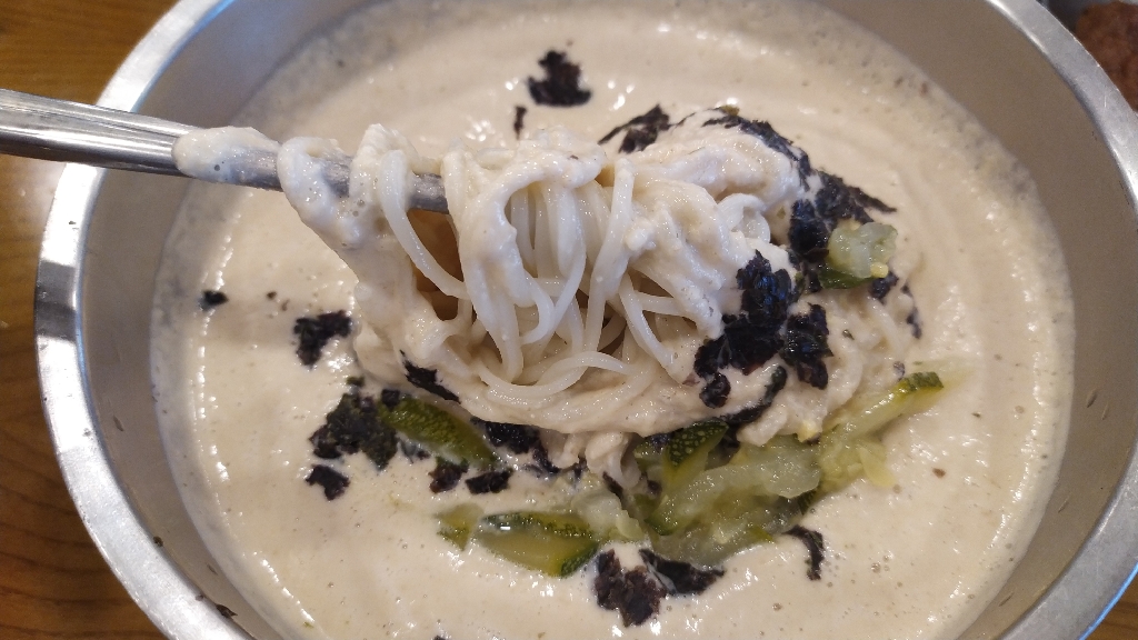기계로 갈았겠지만 콩가루들이 입안에서 씹히는 고소한 맛이 일품이다. 일정하지 않는 콩가루 느낌~ 걸쭉한 콩국물 정말 콩국수는 칠성 할머니 콩국수다!!