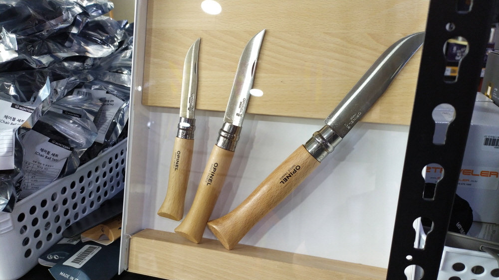 감성 캠퍼 나이프인 프랑스 오피넬 나이프도 전시되어 있습니다. 참고로 나이프 가죽케이스도 판매하고 있더군요.