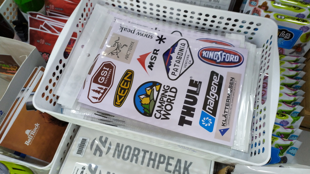 입구 카운터에 있는 캠핑 아니 아웃도어 스티커들... 장당 2,000원에 판매하니 구입해서 아이스박스나 랜턴/물통에 붙여주시면 캠핑용품들이 더 예쁘게 보일 겁니다.