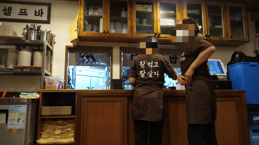 직원들 유니폼에도 잘 먹고 잘 살자라고 적힌 티셔츠를 입고 서빙을 보시네요. 대천 국밥 슬로건 같네요.