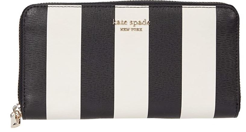 - Kate Spade New York® Spencer Stripe Zip Around Continental Wallet은 골드 톤 하드웨어 로고가 있는 사 피아노 가죽으로 제작되었습니다.