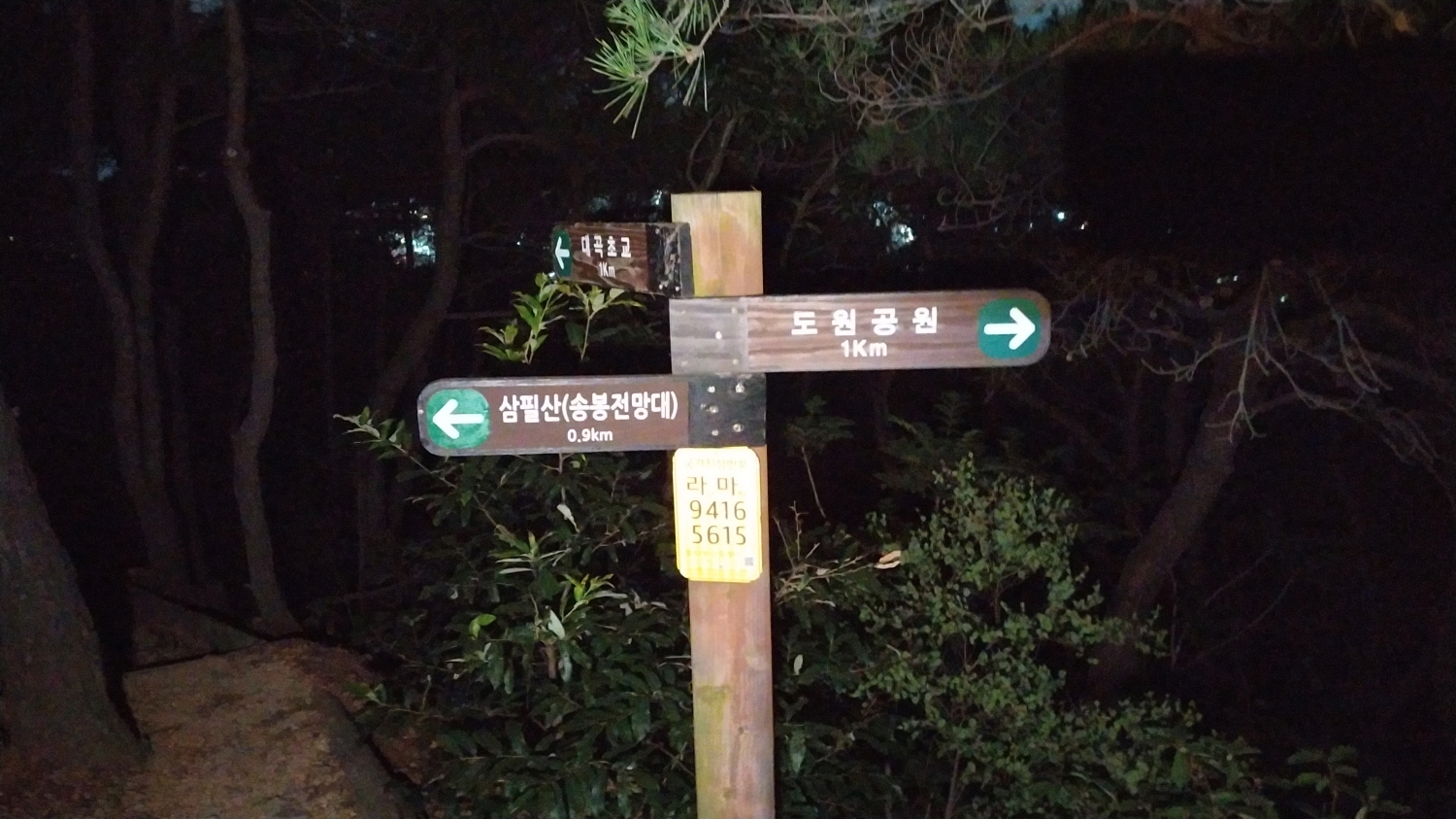 그리고 200m 올라오면 또 다른 등산로 길이 나타납니다. 밤이라 또렷한 사진을 찍을 수는 없었지만 대곡초교/도원공원 등산로 길을 안내하고 있습니다.