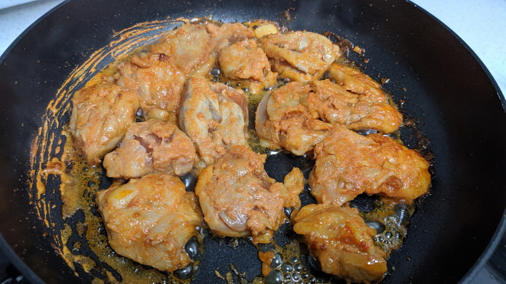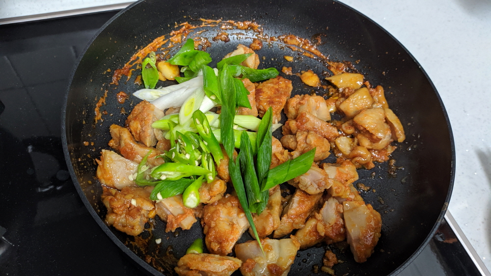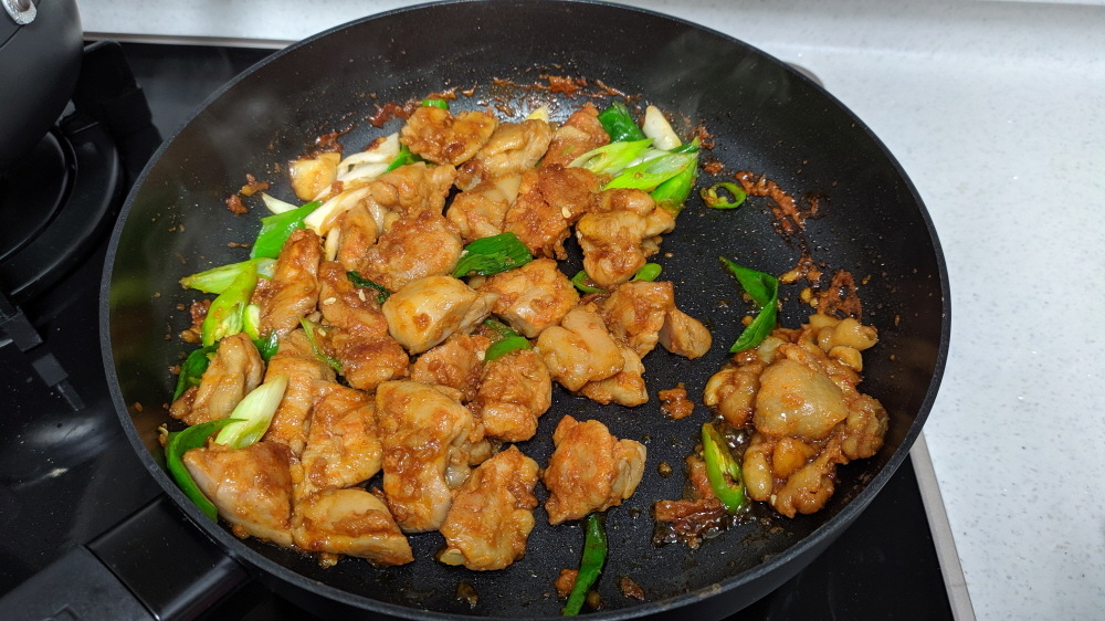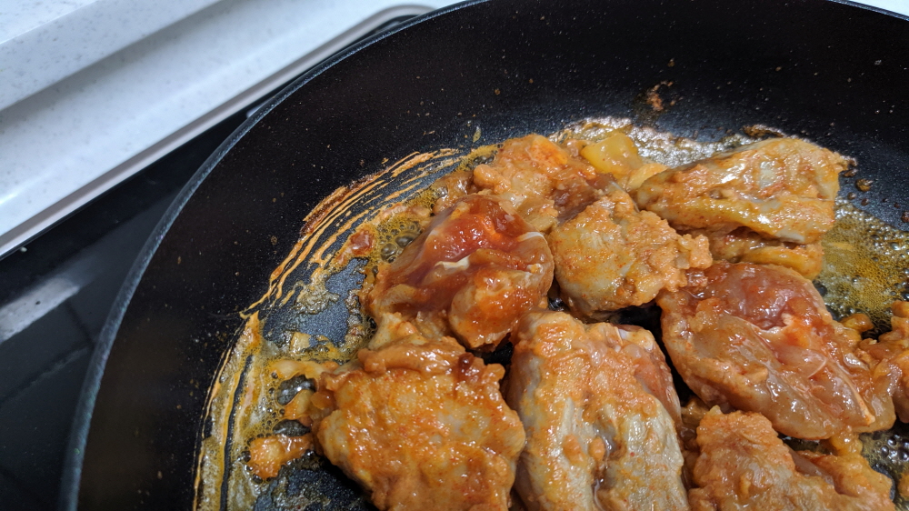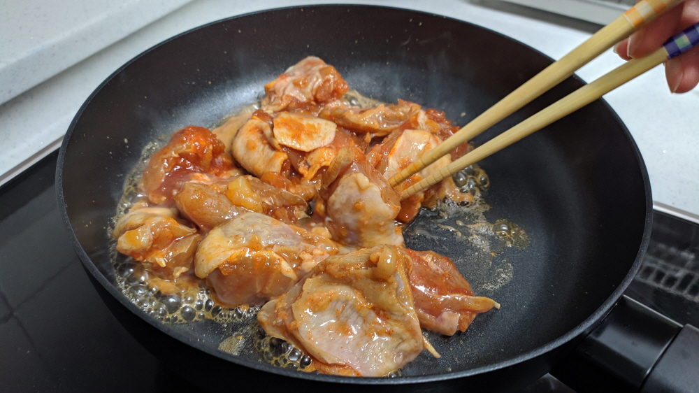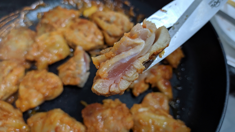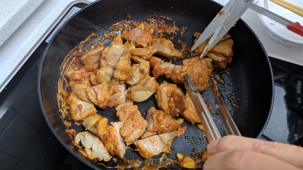 그리고 아이들이 싫어하는 닭껍질까지 분리한다. 중불이라 그런지 양념소스가 점점 사라지고 있다. 닭고기의 굵기를 생각하면 소스의 양이 다소 부족함까지 느껴진다. 아니면 별도로 소스를 라면수프 정도 더 넣어주면 좋을듯하다.