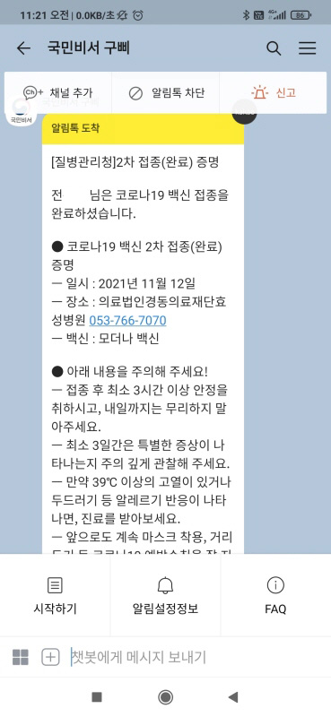 국민 비서 구삐? 카톡 알림 톡이 도착해 있었다. 1차를 10월 15일 접종했고, 2차 접종일을 안내해 주는 알림톡이다. 정말이지 대한민국은 의료강국이 분명해보인다. 물론 2차 접종후에도 알림톡이 왔다.