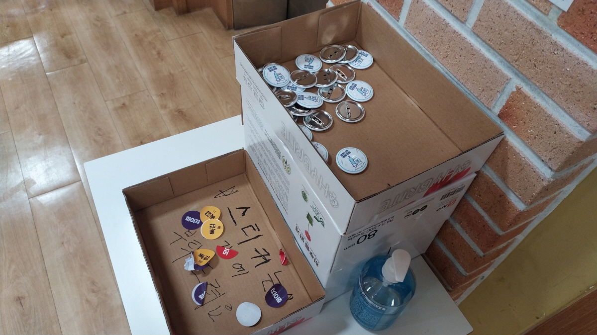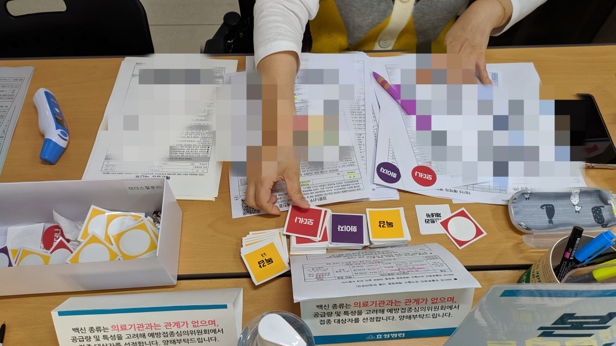 이곳에서는 독감 접종과 코로나 접종을 함께 실시하고 있다. 사진의 보이는 뱃지는 2차까지 완료하신 분들이 가져가는 것이라고 한다. 필자는 1차라 패스다!