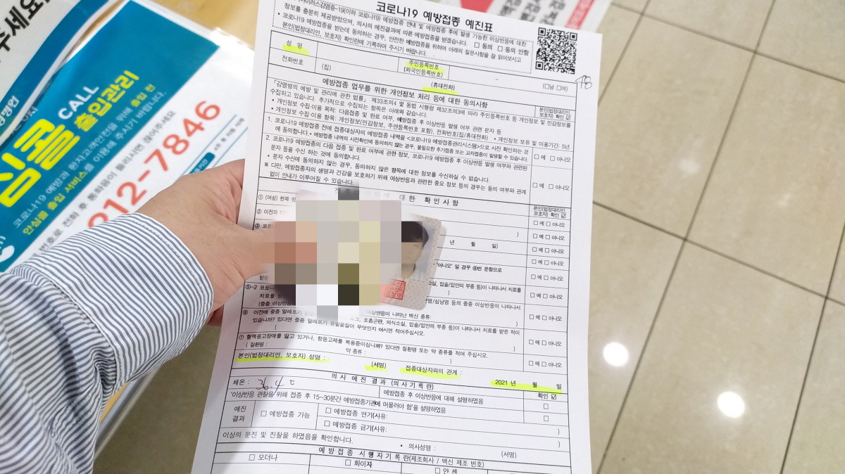 입구에서 열 체크 후 코로나19 예방접종 예진표를 받고 지하로 내려간다.
