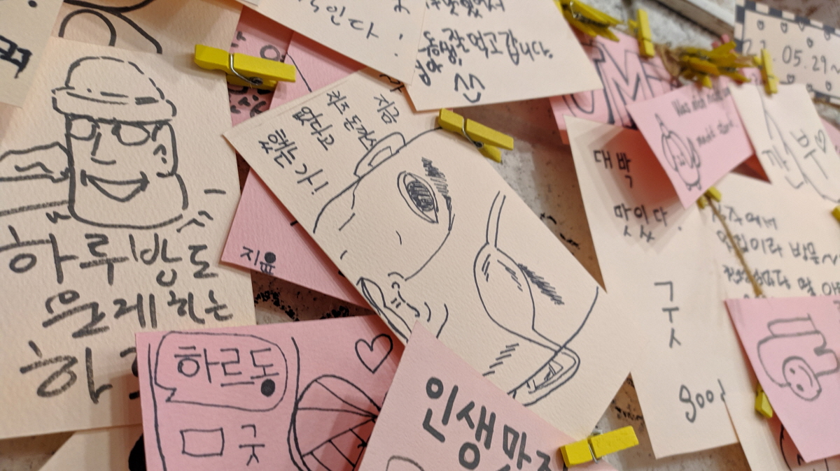 주문한 식사를 기다리면 눈요기까지 된다. 다들 글솜씨는 물론 그림 그리는 실력까지 대단하다.