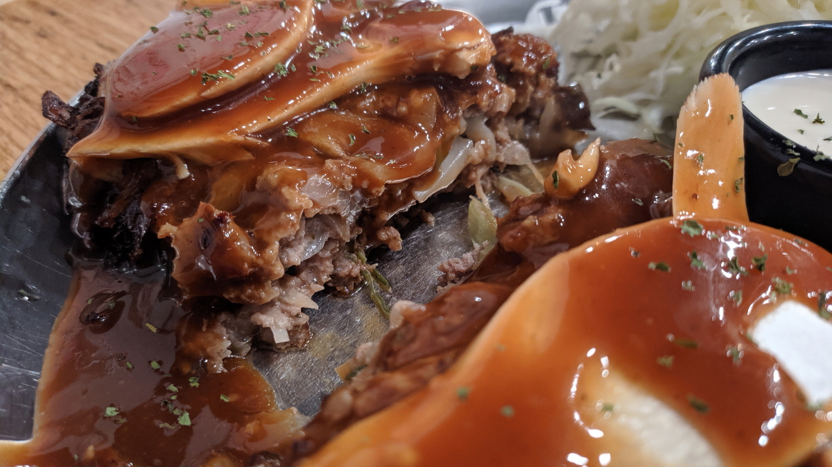 양파와 소스 그리고 쇠고기 육즙의 조화가 혀를 아주 미치게 한다.