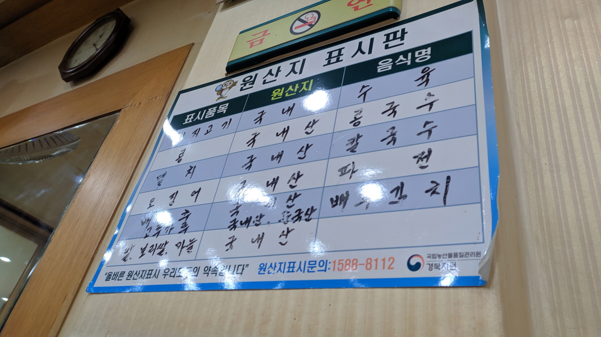 요즘 식당들 공통점이 고춧가루만 중국산을 쓰고 있다 대구 손칼국수 역시 고춧가루만 중국산이고 나머지 재료들의 원산지는 모두 국내산을 사용하고 있다.