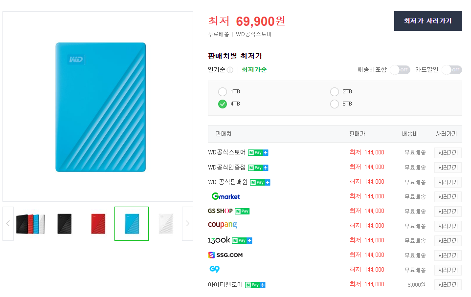 아래의 가격은 WD NEW My Passport Gen3 1TB 가격 69,900원 2021-12-30일 자이다. 필자는 외장하드 1 테라를 2개나 가지고 있기에 좀 더 큰 용량의 외장하드가 필요해서 다음의 제품들 가격을 알아보았다. 사실 여유만 있다면 외장 SSD 하드로 구입하고 싶었지만 가격을 보고 순간 당황! 하고 포기했다.