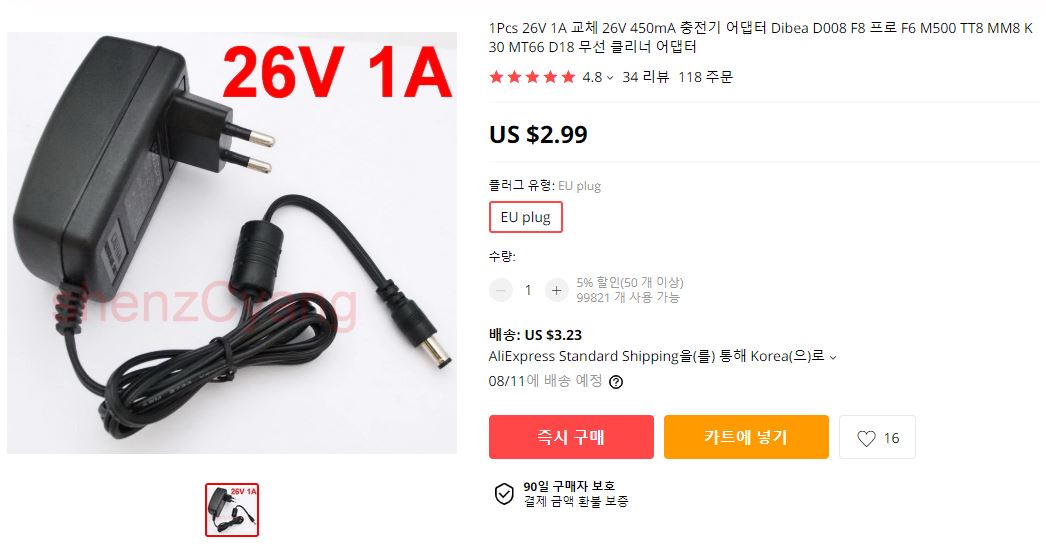 디베아 D18 정품 아답터 가격은 상상을 넘어 무선청소기를 버리게 만든다. 그래서 필자는 알리에서 직구를 해보기로 했다. 직구로 구입할 수 있는 가격은 너무나 저렴했고 행동으로 옮겨지게 되었다.